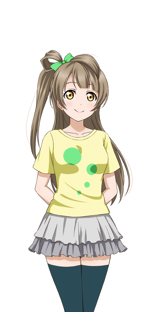 Kotori Minami is a main character in Love Live. She was a second-year at Otonokizaka High School before graduating at the end of Love Live! The School Idol Movie. She is also known as "Legendary Maid Minalinsky" while working in Akihabara. She is the member of Printemps, a sub-unit under µ's. Her image color is white, through she is also represented with green or grey. Her solo album is called Kotori, Lovin' You.