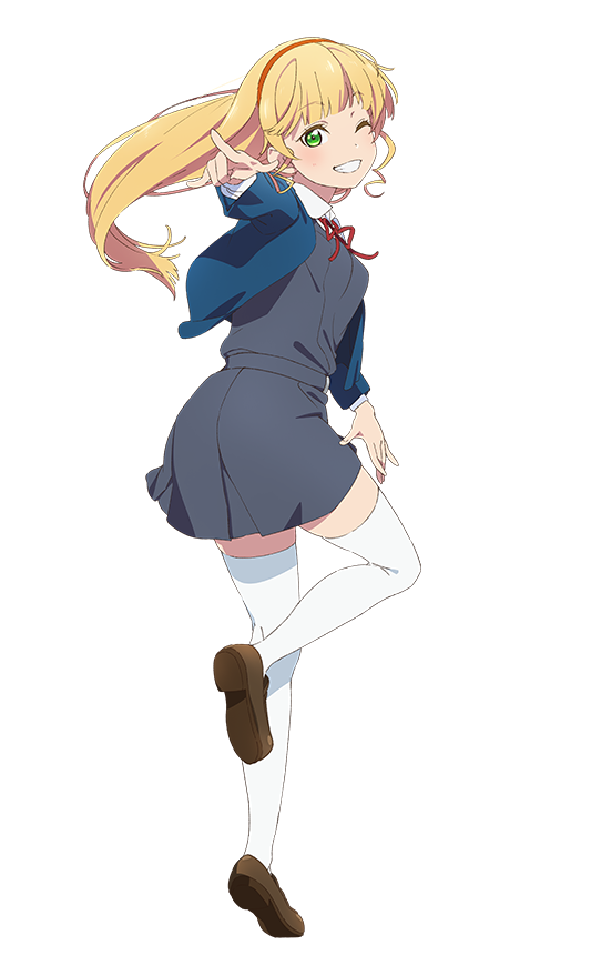 Sumire has a slim and tall figure with long legs, long hime cut blond hair, melon green eyes, and wears a red headband. She is considered to possess ideals of an all-round natural feminine beauty.